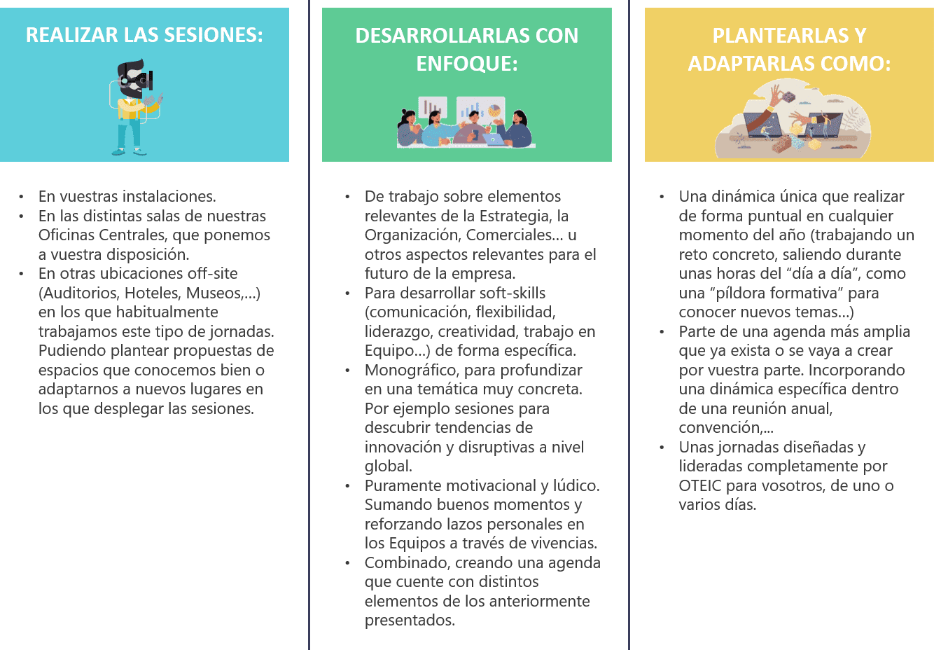 Utilizamos diversas metodologías e incorporamos un abanico de dinámicas que pueden albergar desde ejercicios más cercanos a la estrategia, retos comerciales, desarrollo profesional y personal,… hasta otros más lúdicos y divertidos, dependiendo del enfoque de la sesión.
